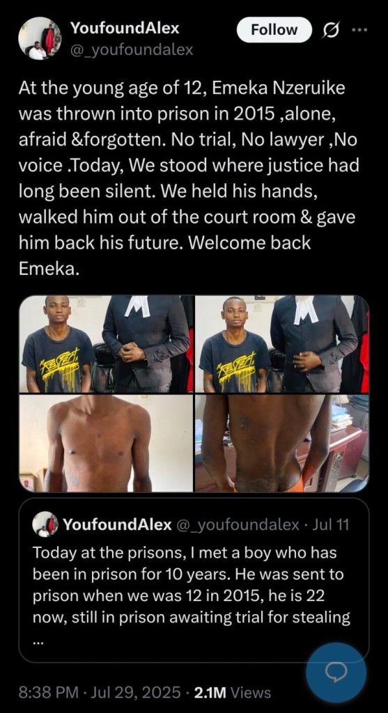 The story was shared on X (formerly Twitter) by user @_youfoundalex, a lawyer, who revealed that the boy, identified as Emeka Nzeruike, had been detained without a lawyer, trial, or any form of legal representation since his arrest.