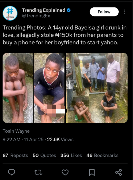 A young lady from Bayelsa has been accused of stealing ₦150,000 from her parents to purchase a new phone for her younger boyfriend, allegedly to help him begin a career in internet fraud, commonly referred to as “Yahoo.”
