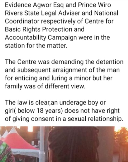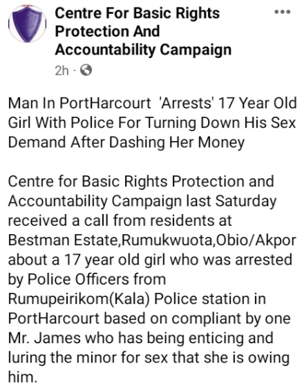 “Centre for Basic Rights Protection and Accountability Campaign last Saturday received a call from residents at Bestman Estate,Rumukwuota,Obio/Akpor about a 17 year old girl who was arrested by Police Officers from Rumupeirikom(Kala) Police station in PortHarcourt based on compliant by one Mr. James who has being enticing and luring the minor for sex that she is owing him,” the statement read.