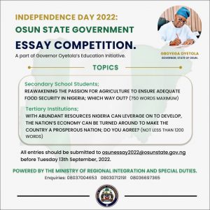“All entries should be submitted in the approved format to: osunessay2022@osunstate.gov.ng before Tuesday 13th September, 2022.”