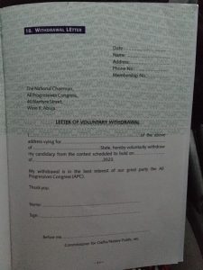 Tagged Form 18, it states that: “I hereby voluntarily withdraw my candidacy from the contest. My withdrawal is in the best interest of our great party, the All Progressives Congress.”