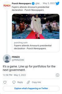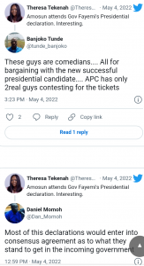Dolapo Drizzle stated: “Amosun was present at Fayemi’s declaration earlier today. He himself is declaring tomorrow. This Abuja presidential race go funny die.”
