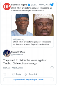 King David opined that, “Don’t be surprised that Tinubu chose to fund Fayemi and Amosun so that at the 11th hour, they will divert their supporters/delegate to Tinubu in form of stepping down for him. Don’t be surprised if it happens.”