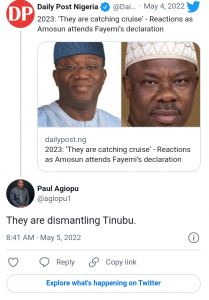 Jaiye Olugbenga tweeted: “Amosun attends Gov Fayemi’s Presidential declaration. Interesting.”