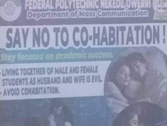 A billboard spotted at the Federal Polytechnic Nekede in Owerri, warns students against cohabitation. According to the billboard mounted by the Department of Mass Communication, Read More