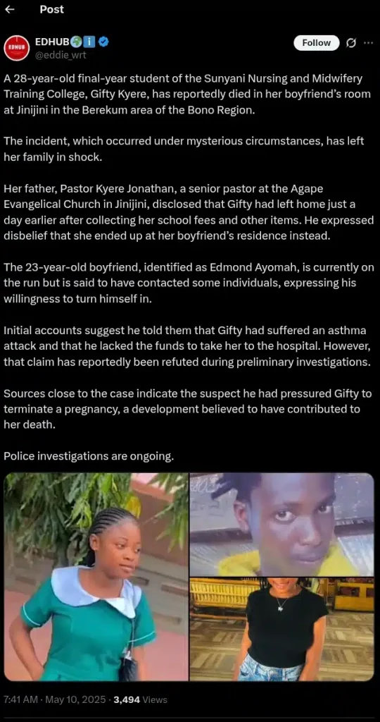 A final-year nursing student from the Sunyani Nursing and Midwifery Training College, Gifty Kyere, has passed away under mysterious circumstances at her boyfriend’s room in Jinijini, Bono Region.