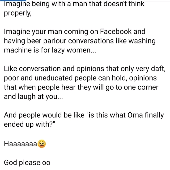 “Imagine your man coming on Facebook and having beer parlour conversations like washing machine is for lazy women…”