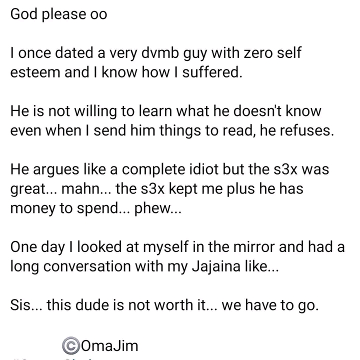 Oma Jim wrote: “One of my greatest fear in relationship and marriage is to be with an unintelligent insecure man with low self-esteem.”