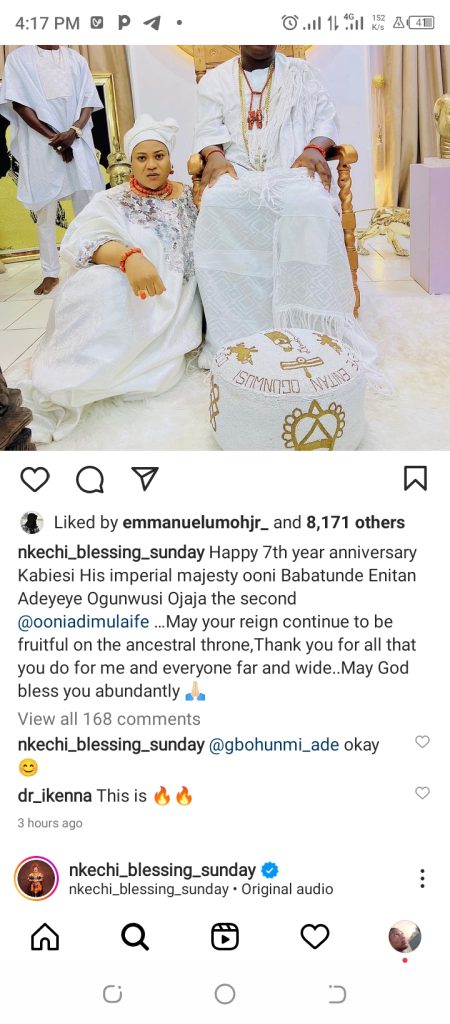 She showered prayers on Ooni saying, “Happy 7th year anniversary Kabiesi, His imperial Majesty, Ooni Babatunde Enitan Adeyeye Ogunwusi, Ojaja the second #ooniadimulaife. May your reign continue to be fruitful on the ancestral throne. Thank you for all that you do for me and everyone far and wide. May God bless you abundantly 🙏🏻”