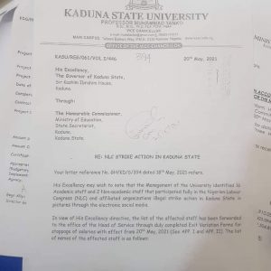Documents showing the dismissal of 16 academic staff and 2 non-academic staff of Kaduna State University by the Kaduna State government over participation in the NLC protest that took place in Kaduna state last month.