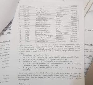 His Excellency may wish to note that the Management of the University identified 16 Academic staff and 2 Non-academic staff that participated fully in the Nigerian Labour Congress (NLC) and affiliated organisation illegal strike action in Kaduna State in pictures through the electronic social media. In view of HIS Excellency directive, the list of the affected staff has been forward to the office of the Head of Service through duly completed Exit Variation Forms stoppage of salaries with effect from 20. May, 2021 (Sec APP Iand 200. 12). The list of names of the affected staff is as follows: