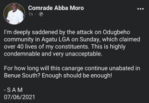 “I’m deeply saddened by the attack on Odugbeho community in Agatu LGA on Sunday, which claimed over 40 lives of my constituents. This is highly condemnable and very unacceptable.