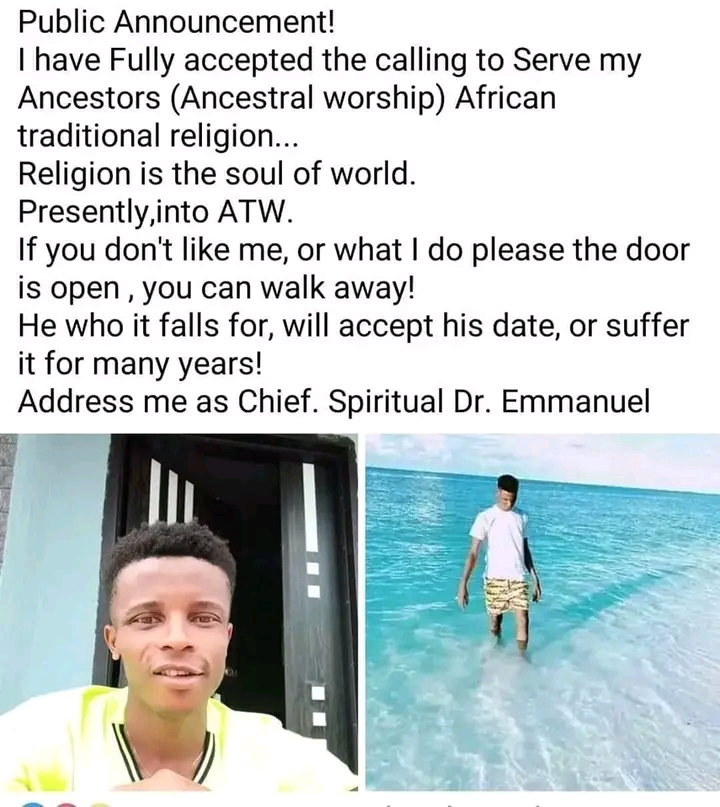 An Akwa Ibom Son, a former pastor for many years since 2013 just dumped Christianity for Traditional African Religion.