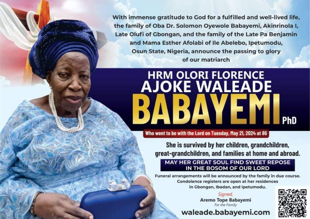 The Christian Wake comes up on Friday, August 2, 2024, by 4pm in Gbongan at the St. Paul’s Cathedral, Gbongan. On Saturday, 3rd August,2024, the funeral service will take place at St Paul’s Cathedral, Gbongan, by 11am.