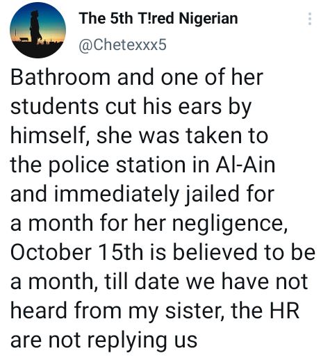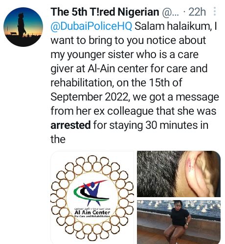 “Salam halaikum, I want to bring to you notice about my younger sister who is a caregiver at Al-Ain center for care and rehabilitation, on the 15th of September 2022, we got a message from her ex colleague that she was arrested for staying 30 minutes in the bathroom and one of her students cut his ears by himself,” the tweet reads.