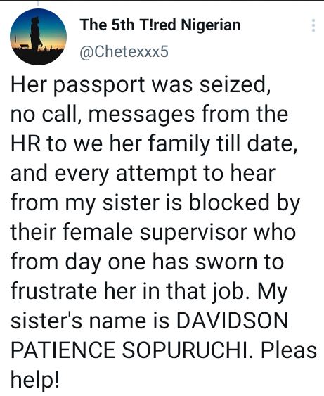 “Her passport was seized, no call, messages from the HR to we her family till date, and every attempt to hear from my sister is blocked by their female supervisor who from day one has sworn to frustrate her in that job. My sister’s name is DAVIDSON PATIENCE SOPURUCHI. Please help,”