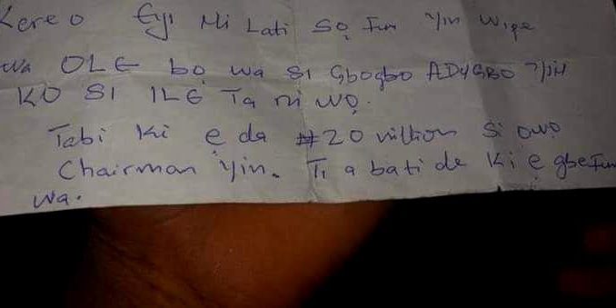 The notice, which was handwritten and partly in Yoruba language, ordered the community to contribute the sum of N20 million to avoid being robbed individually.