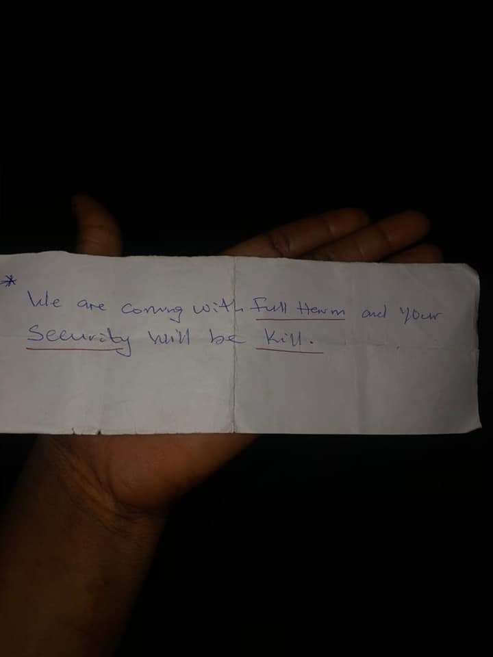 It reads, “Notice, this is to inform you that, we, thieves are coming to rob every house in your community or you should contribute the sum of N20 million and keep it with your community Chairman for us to pick up when we come.