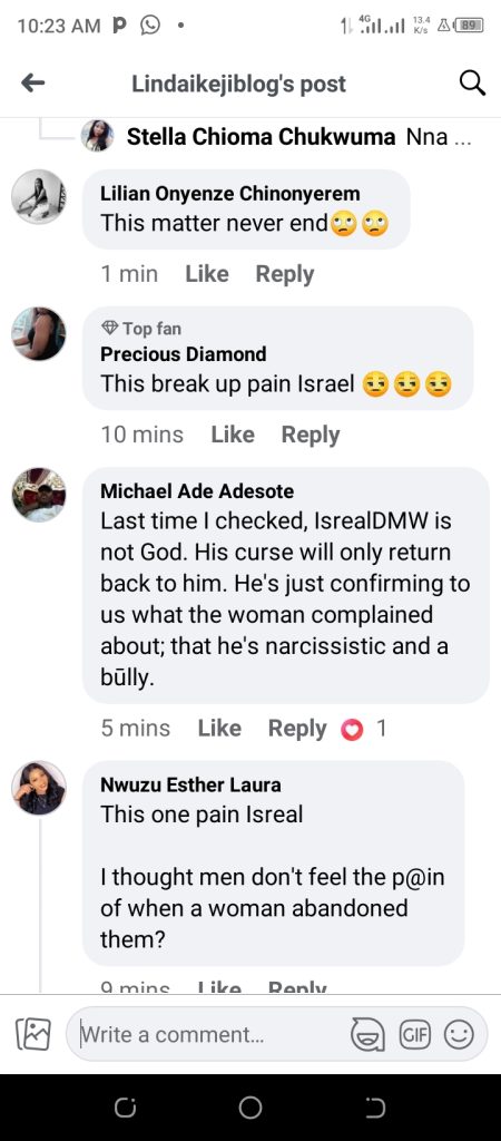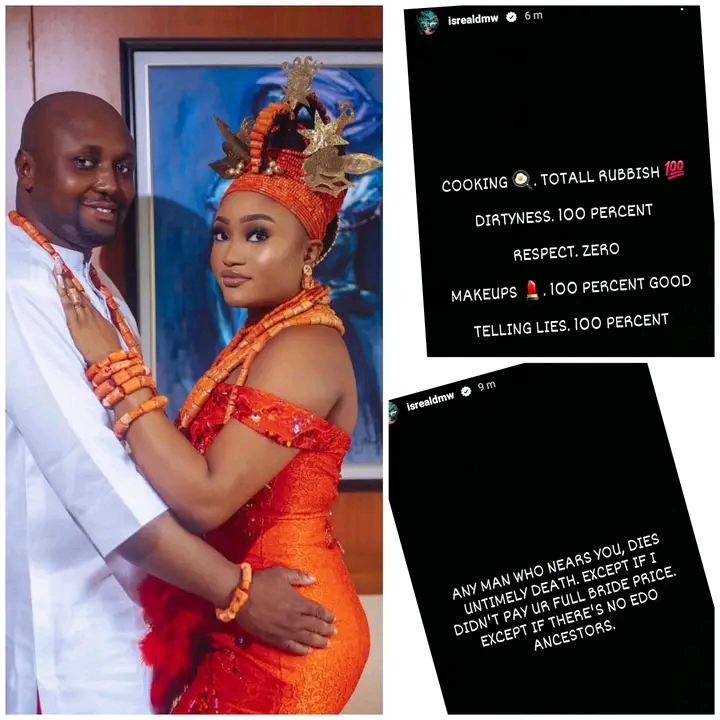 In an Instagram post on Sunday, Israel DMW vowed that any man who nears his ex-wife will die, except if he didn’t pay her bride price in full or if there’s no Edo ancestors.