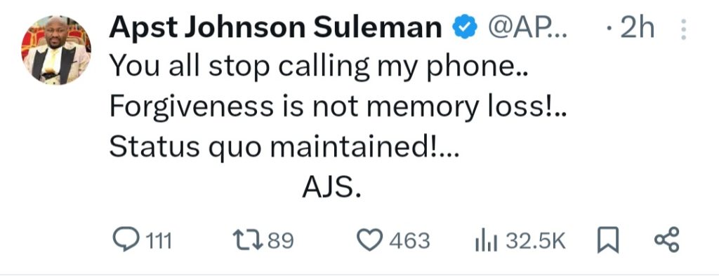 Afterwards, Suleman, leader of the Omega Fire Ministry, took to X to write: “You all stop calling my phone.. Forgiveness is not memory loss!..Status quo maintained!…”