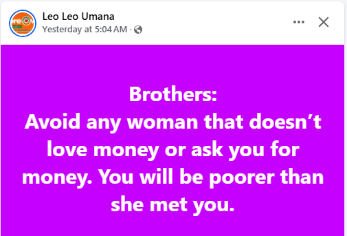 “Brothers: Avoid any woman that doesn’t love money or ask you for money. You will be poorer than she met you,” he wrote in a Facebook post on Monday.
