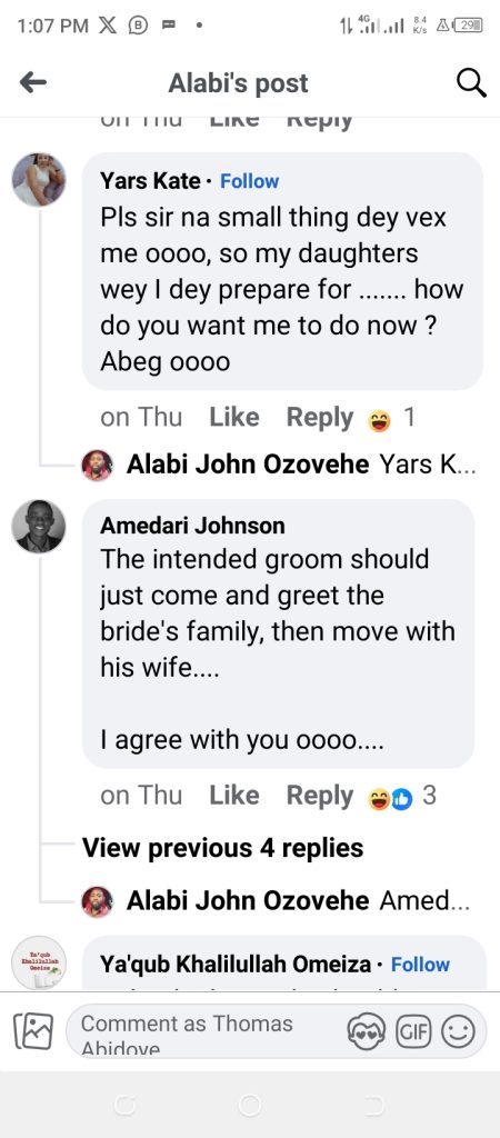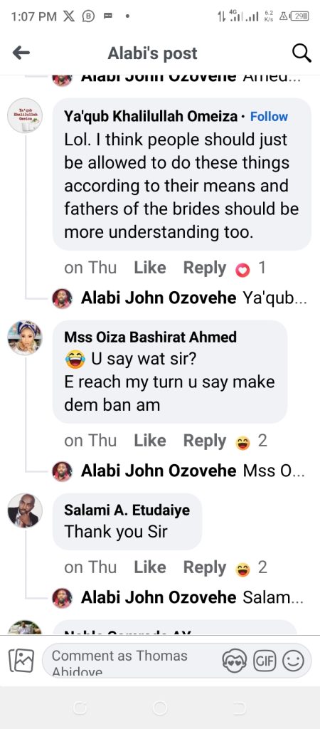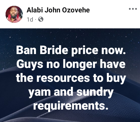 A man from Kogi State, Alabi John Ozovehe, has called for a ban on bride price.
