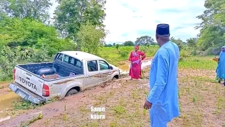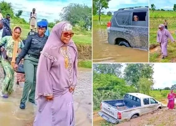 Bauchi first lady forced to walk inside the flooded water as her convoy gets trapped in the mud.