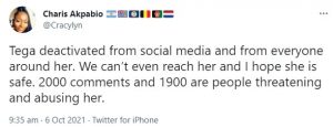 In her words; “Tega deactivated from social media and from everyone around A friend to Big Brother Naija (BBNaija) 2021 contestant, Tega has raised an alarm over the reality TV star’s whereabouts.