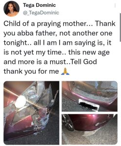 Former Big Brother Naija Shine Ya Eye housemate, Tega Offiong Dominic-Ajeboh popularly known as Tega, is grateful to God for escaping death in a car accident on Sunday night.