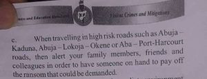 “When travelling in high risk roads such as Abuja -Kaduna, Abuja – Lokoja – Okene or Aba – Port-Harcourt roads, then alert your family members, friends and colleagues in order to have someone on hand to pay off the ransom that could be demanded.”
