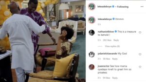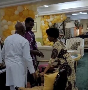 Here is the moment he hugs the birthday celebrant while his wife kneels as a sign of honour and respect.