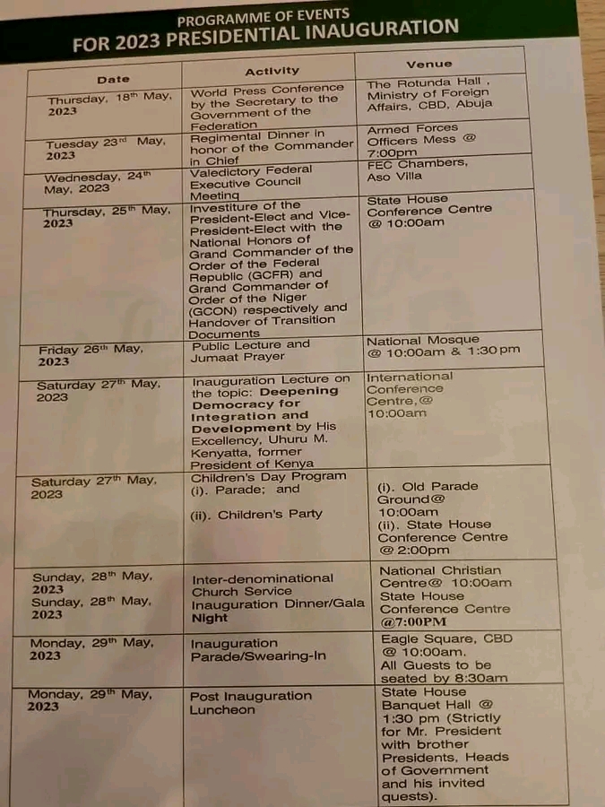 Sharing the programme he said, “Secretary to the Government of the Federation Boss Mustapha unveils the Inauguration Programme for Bola Ahmed Tinubu, the 16th President of Nigeria. The events begin 23 May.”