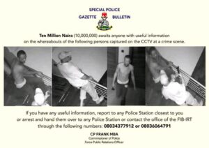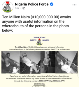 He wrote: “Ten Million Naira (#10,000.000.00) awaits anyone with useful information on the whereabouts of the persons in the photo captured on the CCTV at a crime scene.”