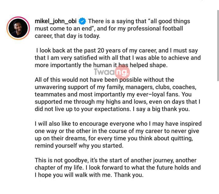 Mikel on his official social media platforms thanked those who supported him to have a successful career.
