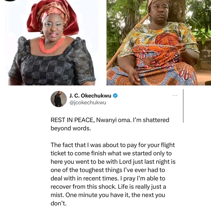 Sharing a photo of the actress, Okechukwu wrote, “REST IN PEACE, Nwanyi oma. I’m shattered beyond words. The fact that I was about to pay for your flight ticket to come to finish what we started only to hear you went to be with Lord just last night is one of the toughest things I’ve ever had to deal with in recent times.