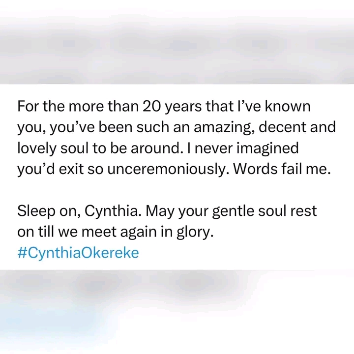 “I never imagined you’d exit so unceremoniously. Words fail me. Sleep on, Cynthia. May your gentle soul rest on till we meet again in glory.”