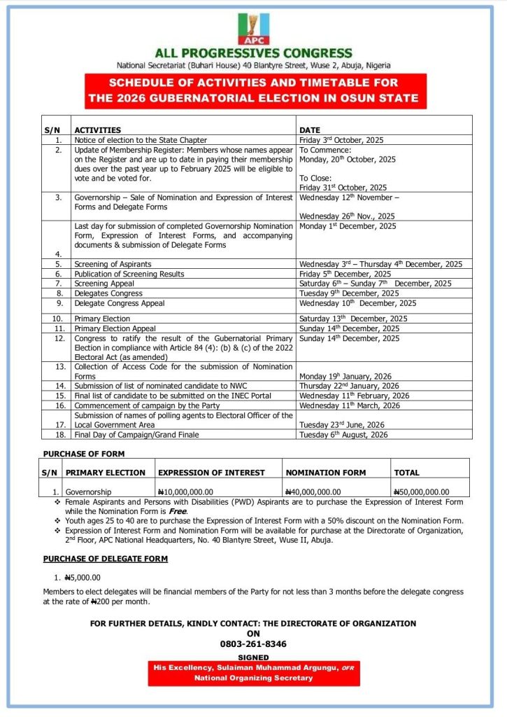 BREAKING: APC Releases Timetable For 2026 Osun Governorship Primary