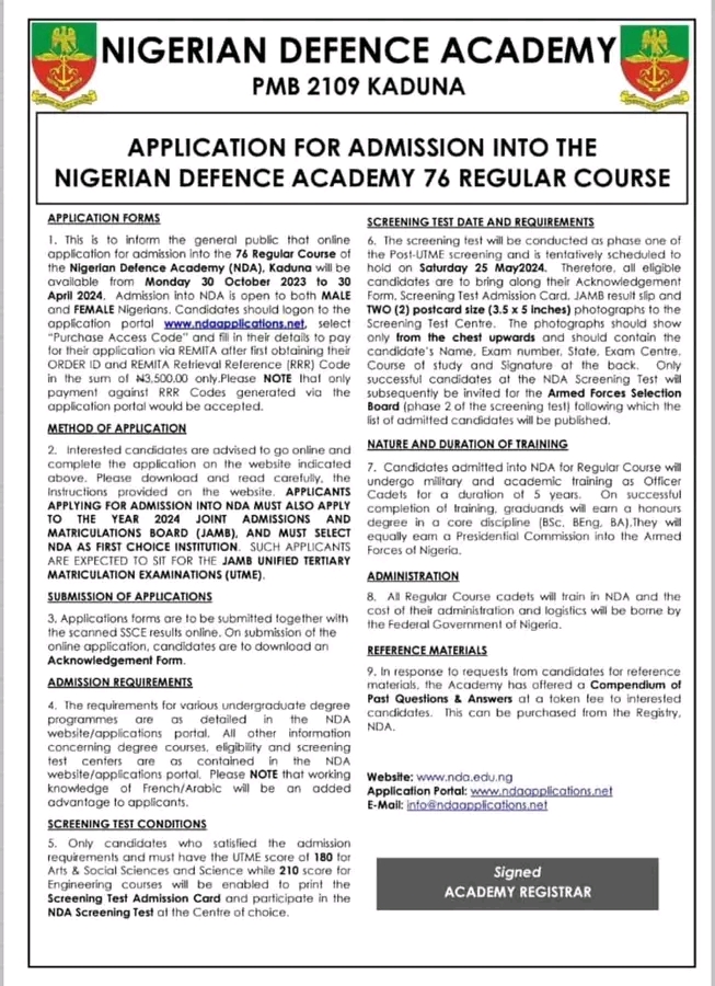The caption reads: “APPLICATION FOR ADMISSION INTO THE NIGERIAN DEFENCE ACADEMY 76 REGULAR COURSE. Download PDF here: https://bitly.ws/YI7C Download Requirements PDF: https://bitly.ws/YI7V