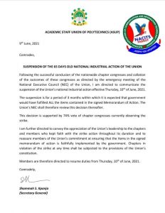 The Academic Staff Union Of Polytechnics (ASUP) has suspended her 65-day old strike.