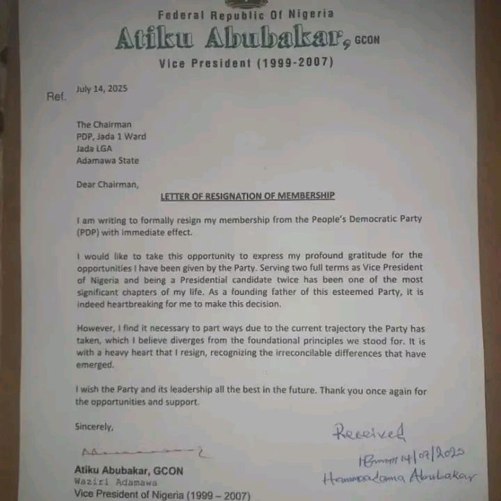 Former Vice President Atiku Abubakar has officially resigned from the People’s Democratic Party (PDP), marking a major shake-up in Nigeria’s opposition politics.