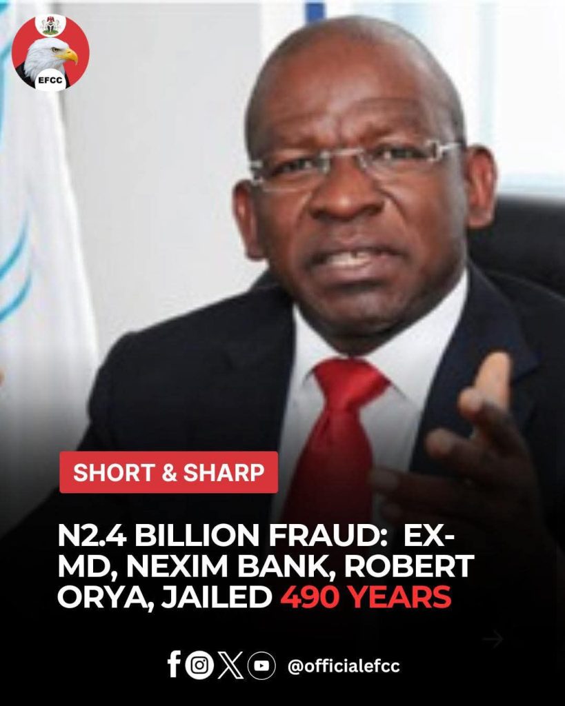 The former Managing Director of the Nigeria Export-Import Bank (NEXIM), Robert Orya, has been sentenced by the Federal High Court in Abuja to 490 years’ imprisonment following his conviction in a ₦2.4 billion fraud case.