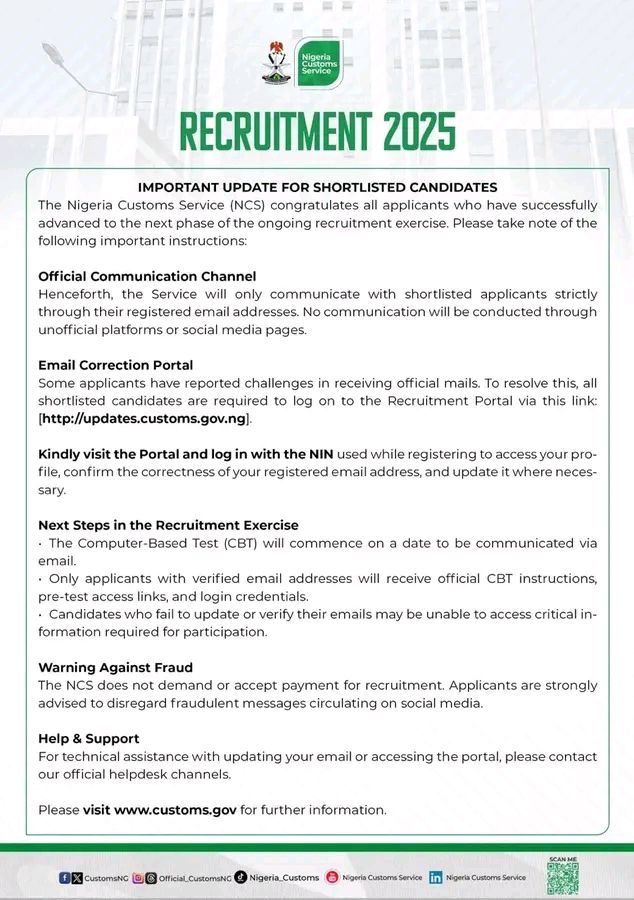 The Nigeria Customs Service (NCS) has released a fresh update regarding its ongoing 2025 recruitment exercise.