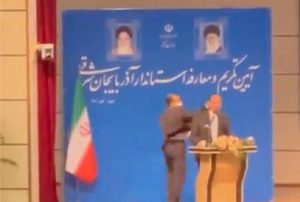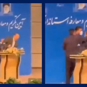 A video posted online by Iran’s semi-official Fars News Agency shows a man calmly walking up to Khorram, slapping him in the face and then shoving him. Security guards can then be seen running toward the offender and pulling him off stage.
