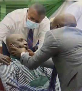 Once he was spotted, several people present at the hearing rushed to his aid, propping him up and attempting to stabilise him, with the proceedings halted.