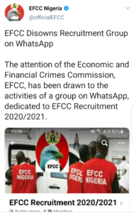 “The attention of the Economic and Financial Crimes Commission, EFCC, has been drawn to the activities of a group on WhatsApp, dedicated to EFCC Recruitment 2020/2021.