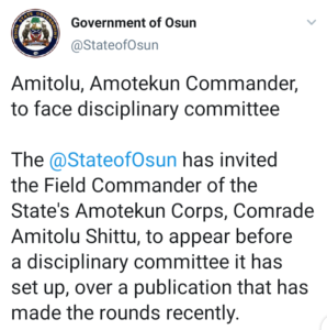 The Osun State Government has invited the Field Commander of the State’s Amotekun Corps, Comrade Amitolu Shittu, to appear before a disciplinary committee it has set up, over a publication that has made the rounds recently.