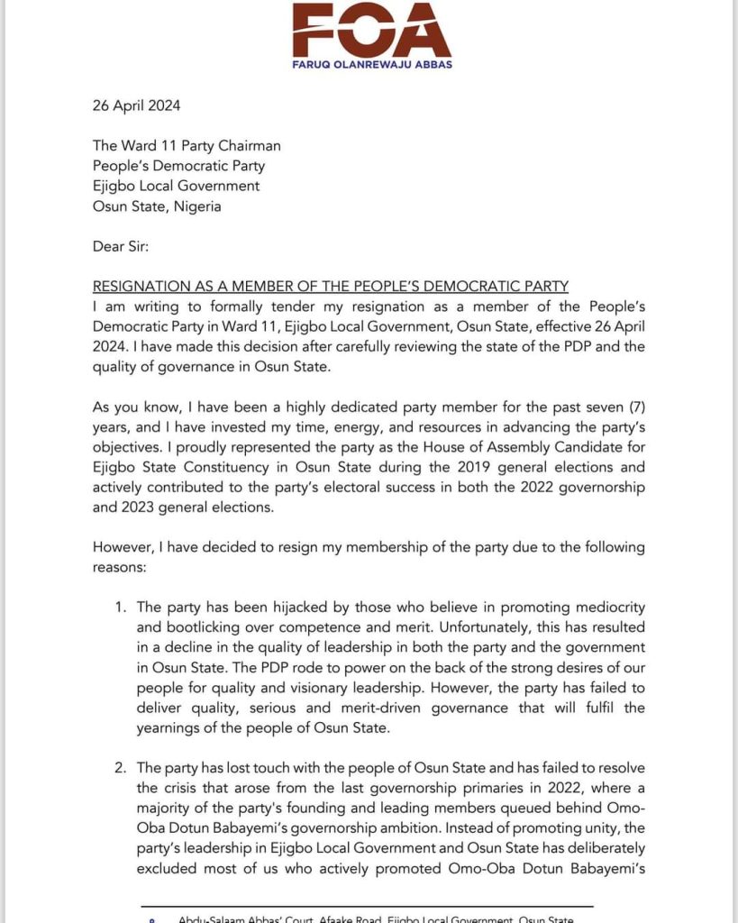 A former candidate for the Ejigbo State Constituency Seat of the Osun State House of Assembly, Barr. Faruk Abbas, alongside many of his followers, have dumped the PDP.