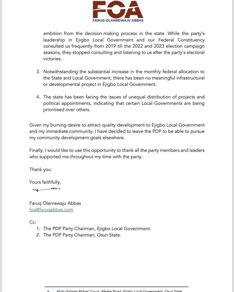 He also stated in his letter of resignation, a copy of which was cited by our correspondent, that “the State has been facing unequal distribution of projects and political appointments, indicating that certain Local Governments are being prioritized over others”, while asserting that there has been no meaningful infrastructural development in Ejigbo Local Government, despite the substantial increase in Federal allocations to Osun State.