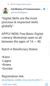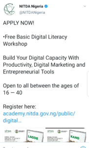 The Federal Government through the National Information Technology Development Agency (NITDA), on Sunday announced free basic digital literary workshop for Nigerian youths between the ages of 16-40.