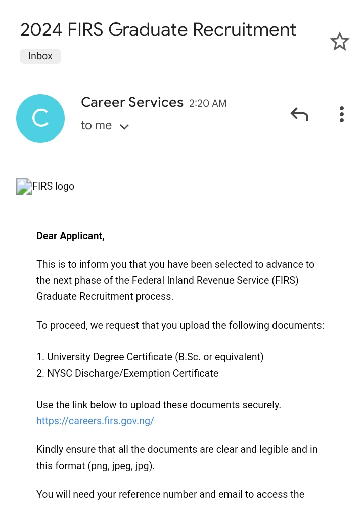 The Federal Inland Revenue Service (FIRS) has sent notifications to applicants shortlisted for the next phase of its graduate recruitment program, according to a message shared with candidates.